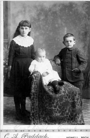 to right: Clara B. age 9, Lou J. age 1, Omer age 6, Photo taken in Howell,