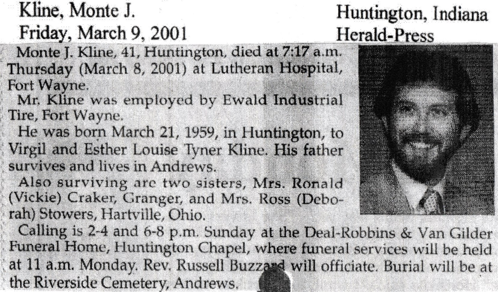 15182.1A11.14 Virgil Everett Kline, b 07 Nov 1923 Huntington; d 25 Mar 2004 (aged 80) Andrews; m Esther Louise Tyner (1925-1989) Children: Debbie, Vicki, and Monte Joseph Kline, b 21 Mar 1959; d 08 Mar 2001;(aged 41)